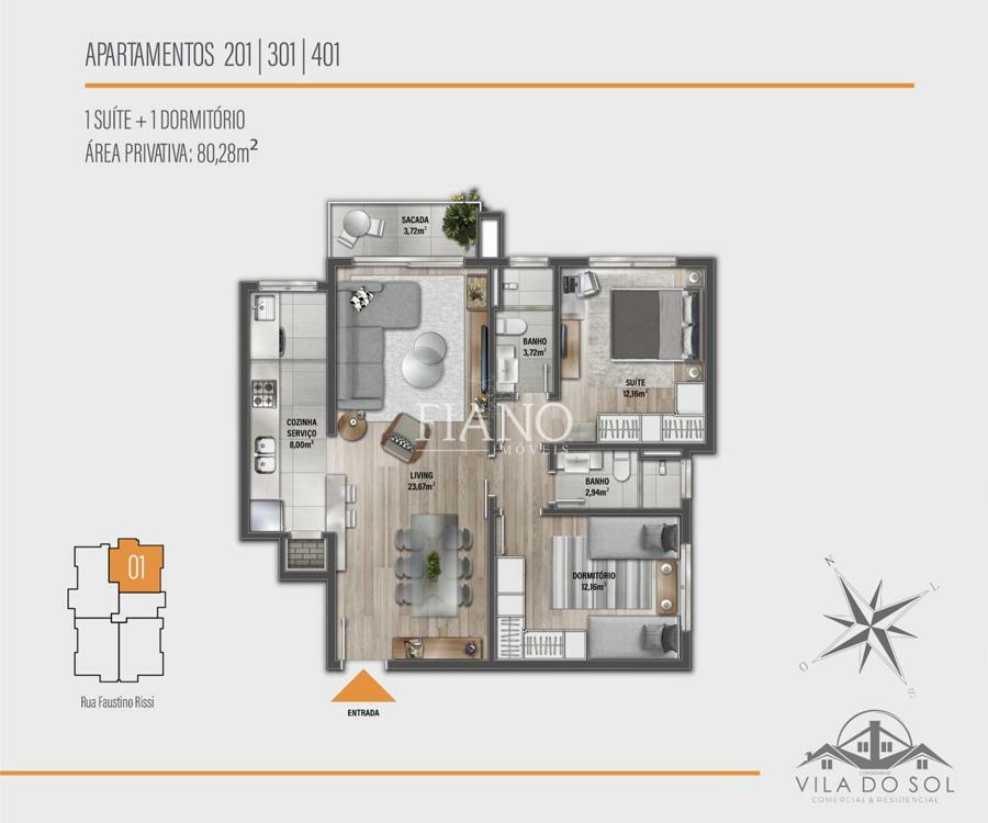 Apartamento de 1 dormitório, banho social, living integrado estar e jantar com lareira e sacada, cozinha com churrasqueira, área de serviço e uma vaga de garagem.