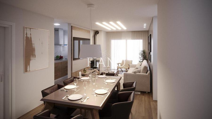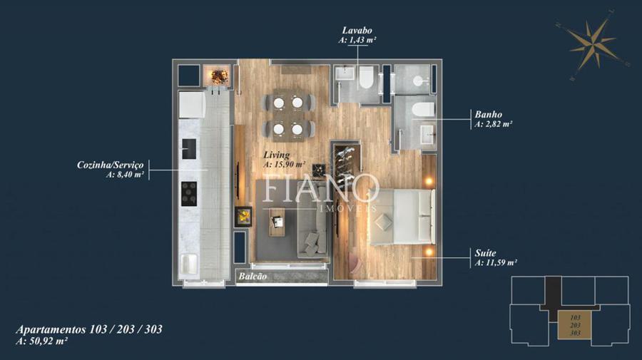 Apartamento de 01 suíte, lavabo, living integrado estar e jantar com sacada, cozinha com churrasqueira, área de serviço, esperas para split, calefação, água quente e lareira, esquadrias em pvc com vidros duplos, piso laminado e porcelanato e uma vaga de garagem.