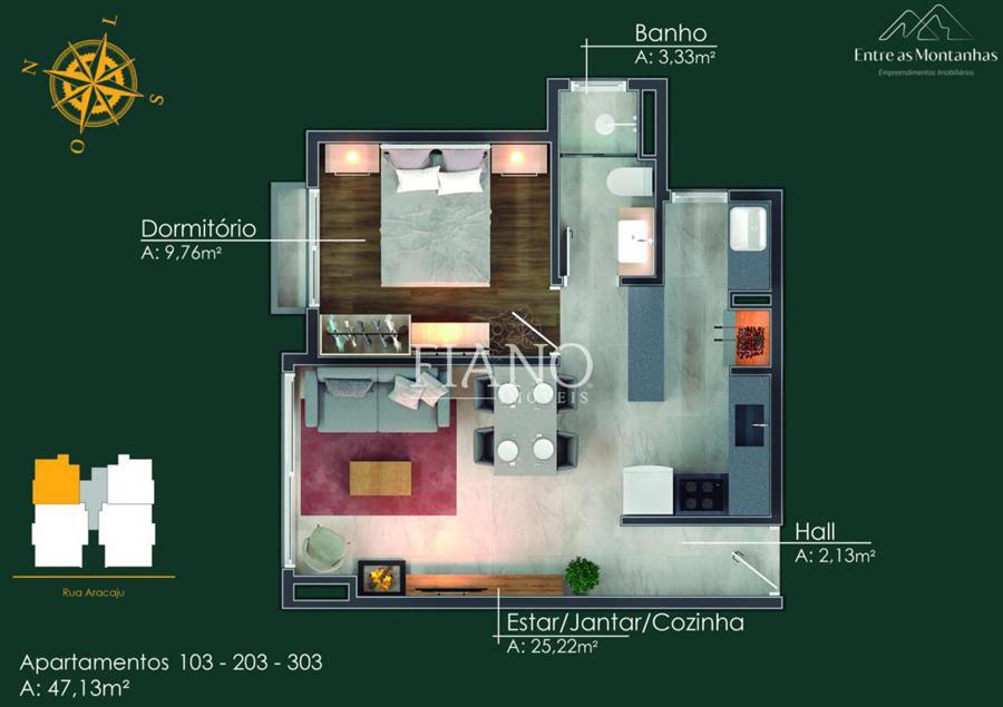 Apartamento de 1 dormitório, banho social, living integrado estar e jantar, cozinha com churrasqueira, área de serviço e 1 vaga de garagem.