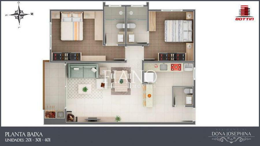 * Porcelanato na sala, cozinha, banheiros, sacadas e áreas de serviço ;