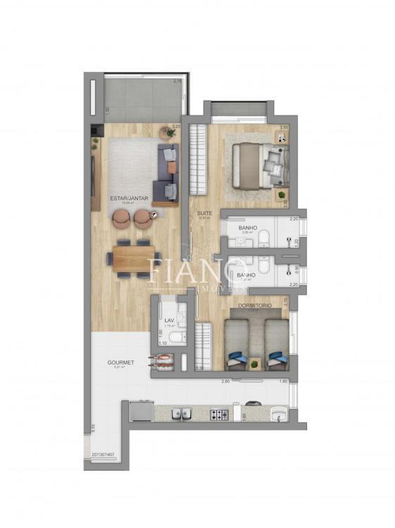 Apartamento de 02 suítes, lavabo, living integrado estar e jantar com sacada, cozinha com churrasqueira, área de serviço e uma vaga de garagem.