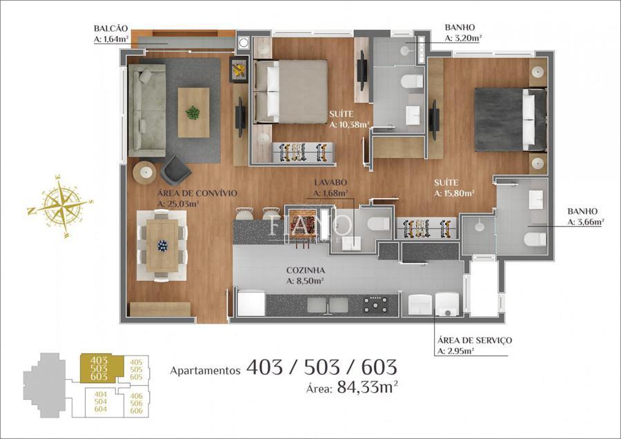 Apartamento com 2 suítes, lavabo, living integrado estar e jantar com sacada, cozinha com churrasqueira, área de serviço, esperas para lareira, calefação, água quente e split, piso porcelanato e laminado, esquadrias em pvc com vidros duplos e 2 vagas de garagem.