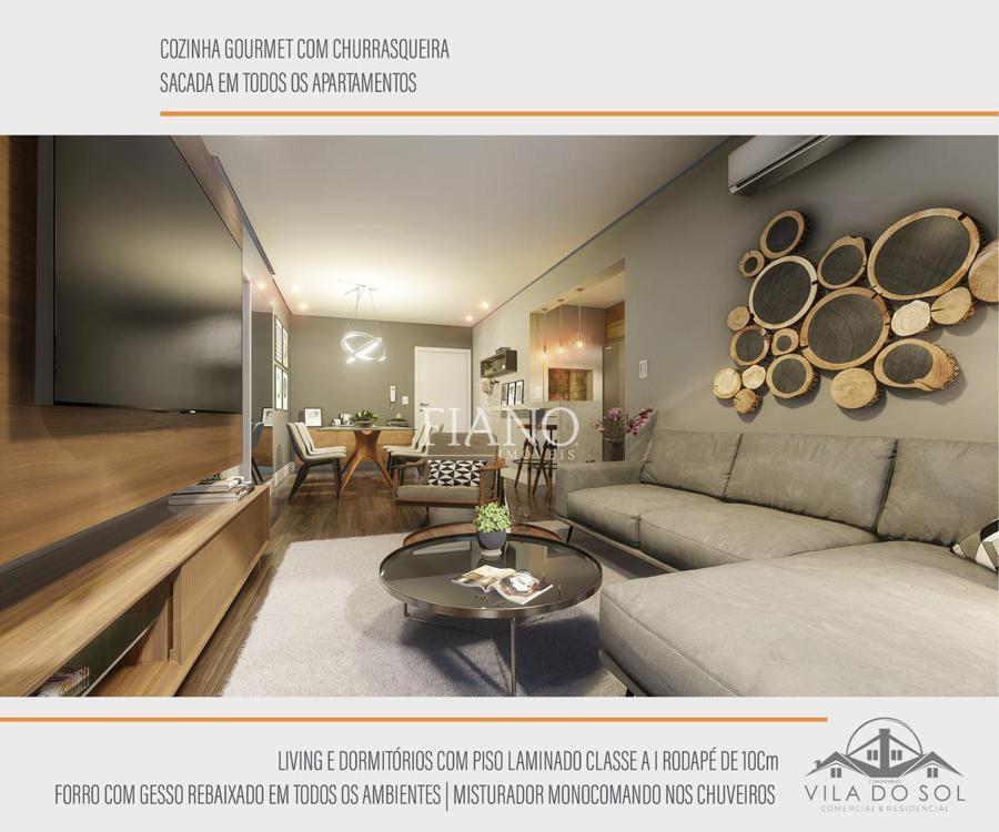 Apartamento de 2 suítes, lavabo, living integrado estar e jantar com lareira e sacada, cozinha com churrasqueira, área de serviço e uma vaga de garagem.