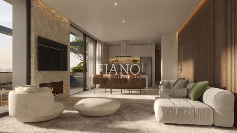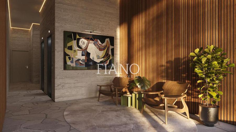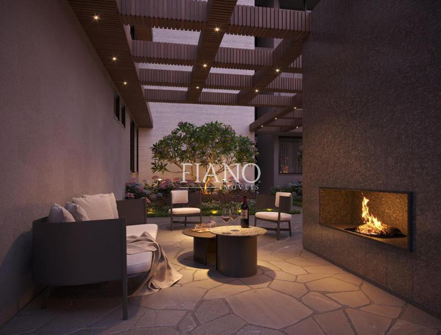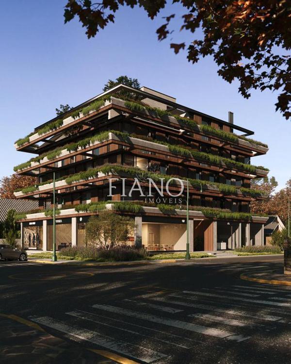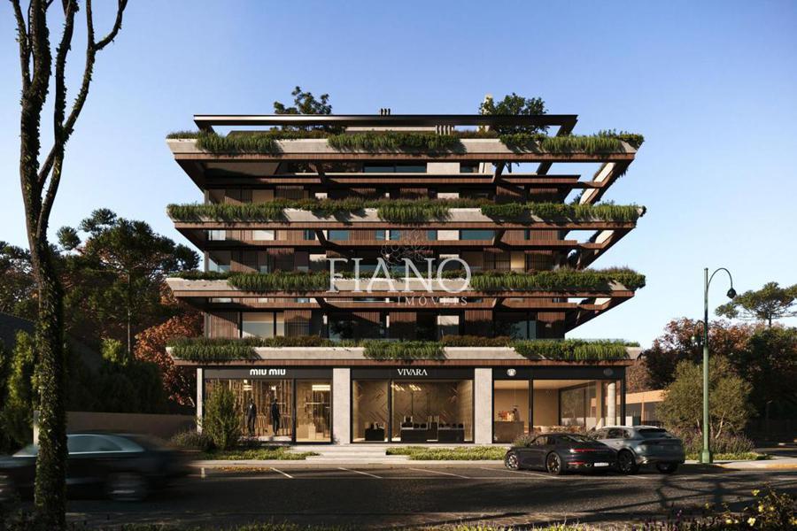 No térreo, espaços comerciais reforçam a ideia de interação com a cidade, tornando o empreendimento um ponto dinâmico no coração de Gramado.