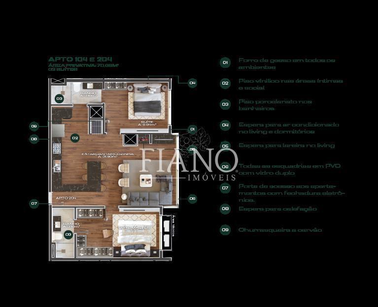 Apartamento 2 suítes (sendo 1 suíte americana), cozinha com churrasqueira, living 2 ambientes, área de serviço, banho social e 1 vaga de garagem. Esperas para split, lareira, calefação e água quente. Condomínio com hall gourmet de acesso ao prédio e sala de estar, totalmente equipado. Lavanderia, espaço do fogo, bicicletário, mirante do pôr do sol e vaga para carro elétrico.