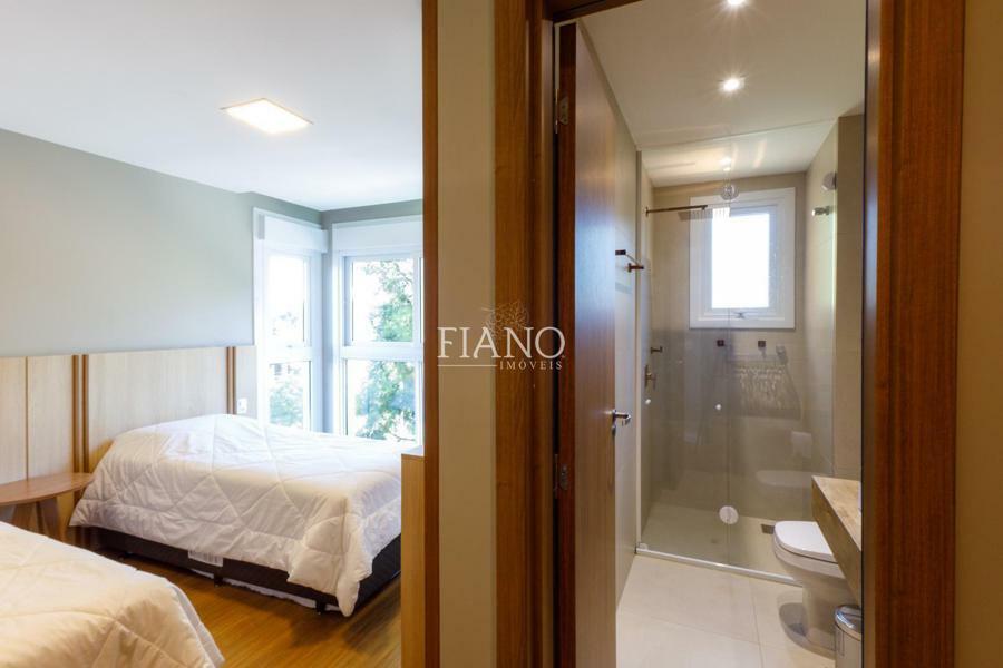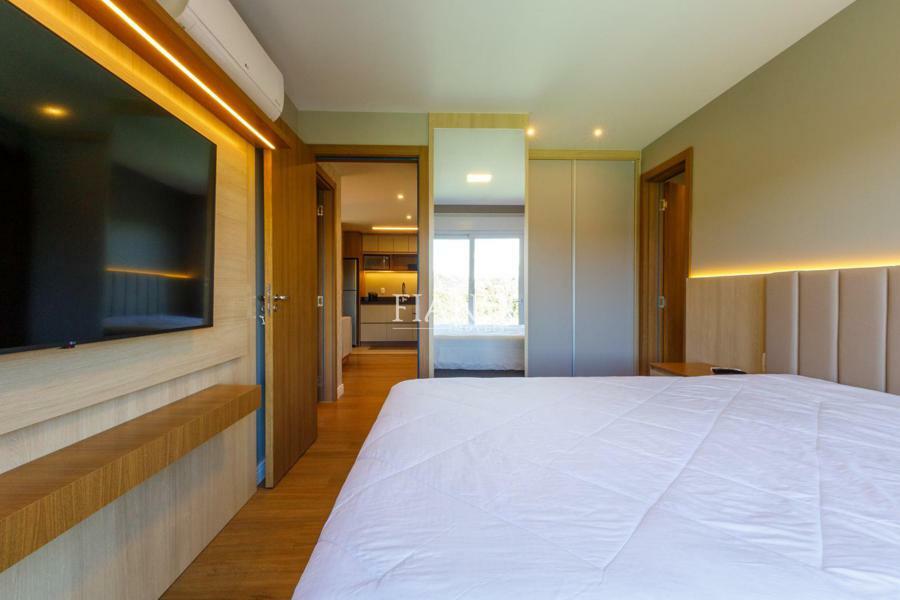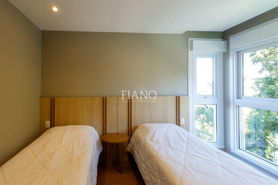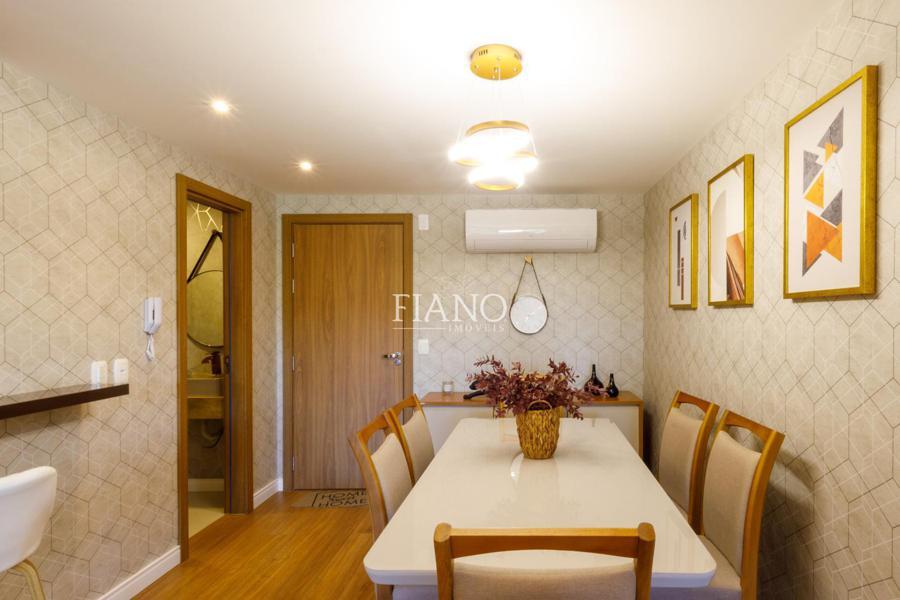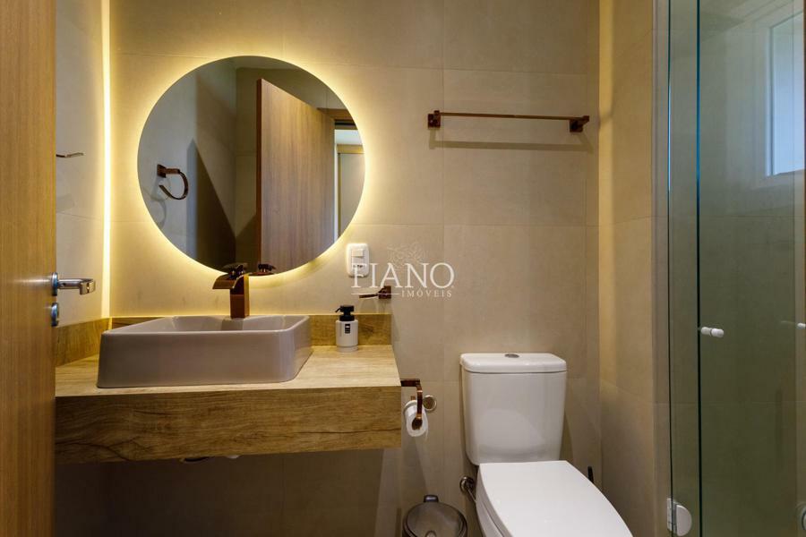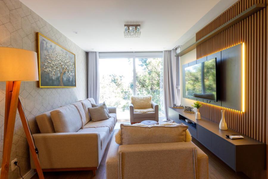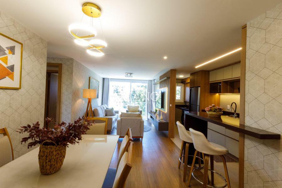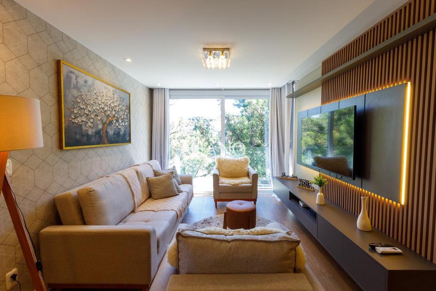 Apartamento com 2 suítes, lavabo, sala estar e jantar com sacada integrada, cozinha com churrasqueira, área de serviço. Espera para lareira.