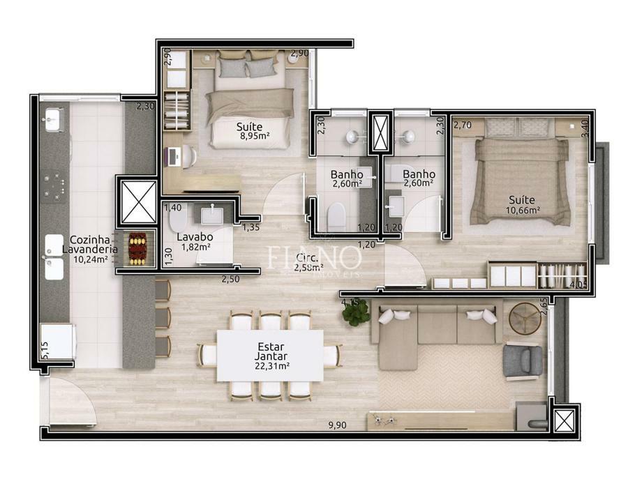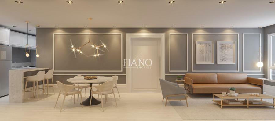 Apartamento com 2 suítes, lavabo, living integrado estar e jantar com sacada e espera para lareira, cozinha com churrasqueira, área de serviço e um box duplo de garagem.
