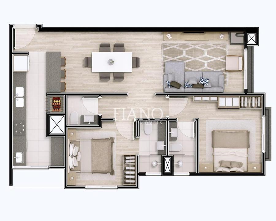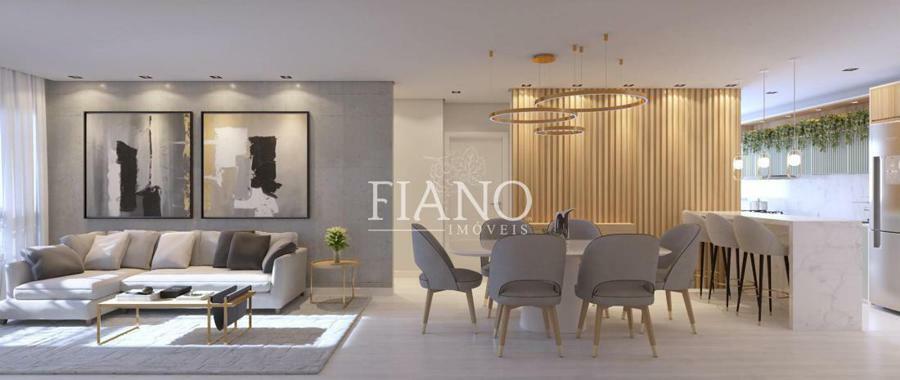 Apartamento com 2 suítes, lavabo, living integrado estar e jantar com sacada e espera para lareira, cozinha com churrasqueira, área de serviço e uma vaga de garagem.