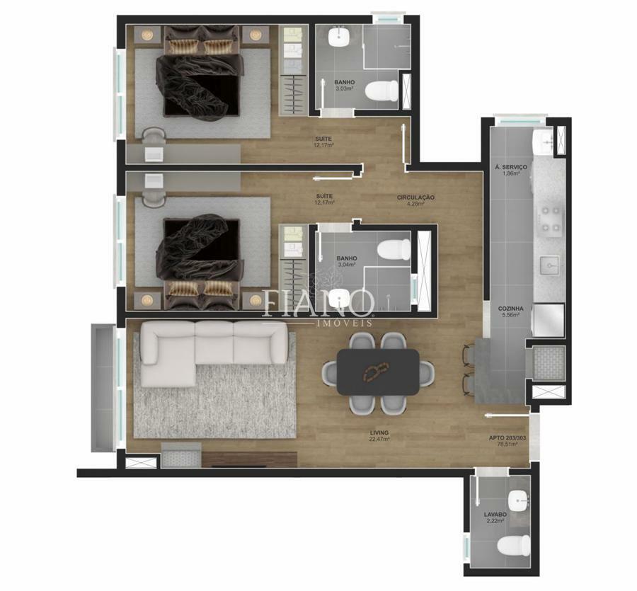 Apartamento de 2 suítes, lavabo, living integrado estar e jantar com sacada, cozinha com churrasqueira e uma vaga de garagem.