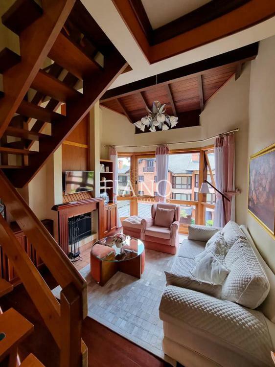 Apartamento duplex de 3 dormitórios, banho social, cozinha com churrasqueira, área de serviço, lareira, ar condicionado em todos os quartos, mobiliado e com vista para um lindo jardim.