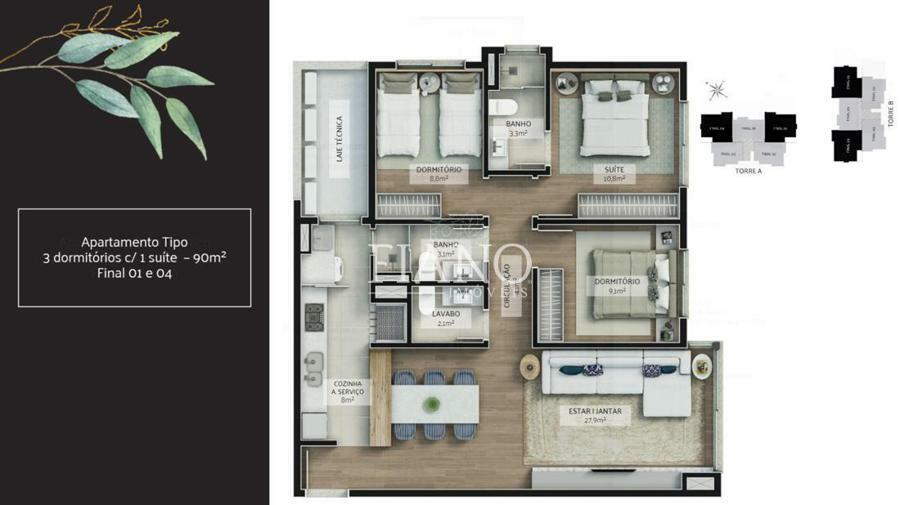 Apartamento de 03 dormitórios (1 suíte), banheiro social, sala de jantar e sala de estar, cozinha e área de serviço.