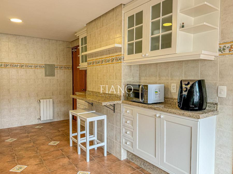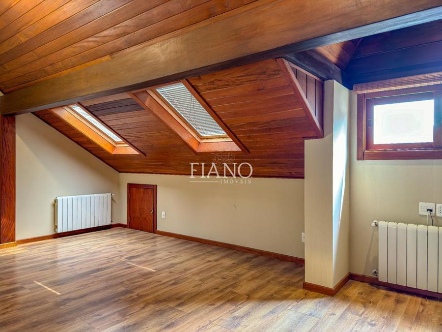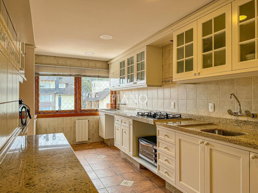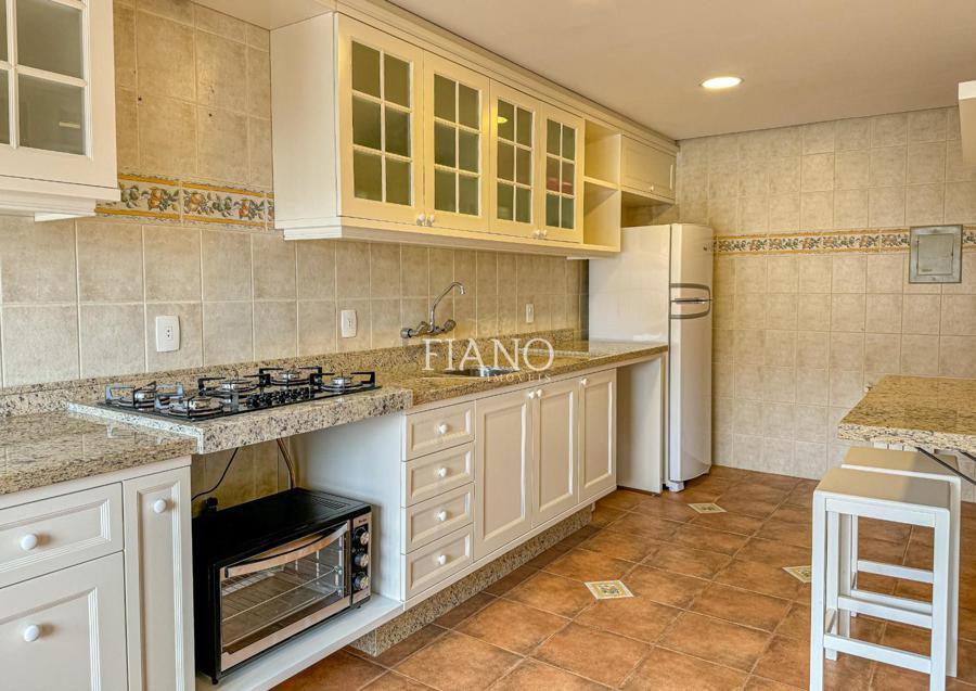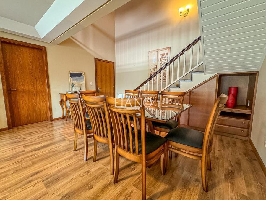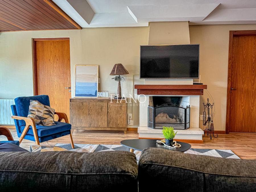 São 04 dormitórios (02 suítes), living integrado estar e jantar com lareira e sacada, banho social, cozinha fechada, área de serviço, estar íntimo com lareira, espaço gourmet com churrasqueira, terraço. Calefação, split e água quente.