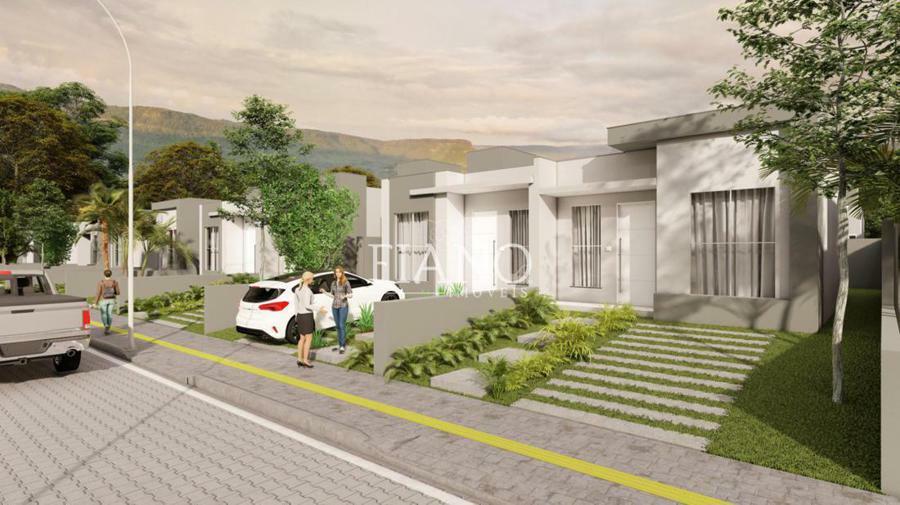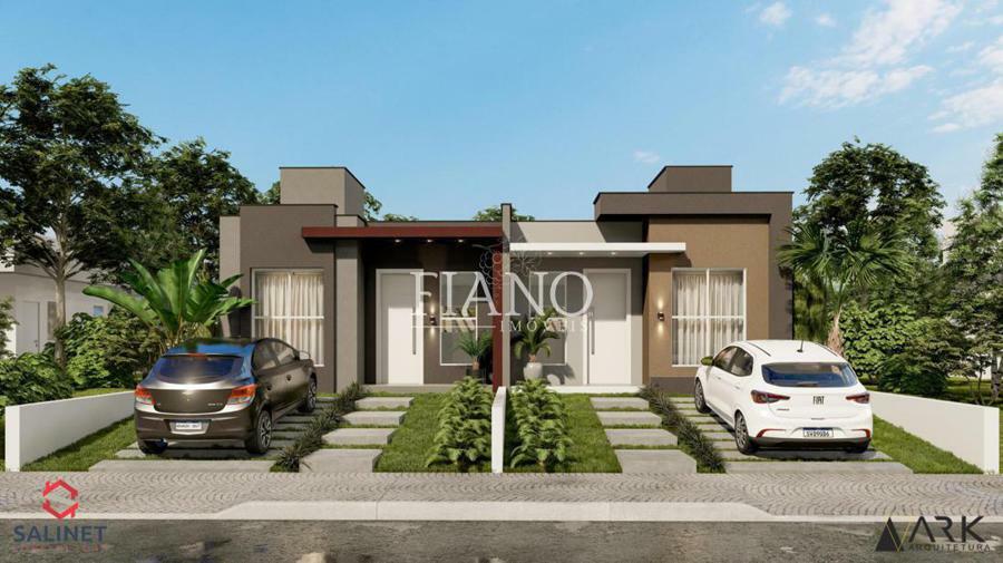 Casa com 2 suítes, lavabo, living integrado estar e jantar, cozinha, área de serviço.