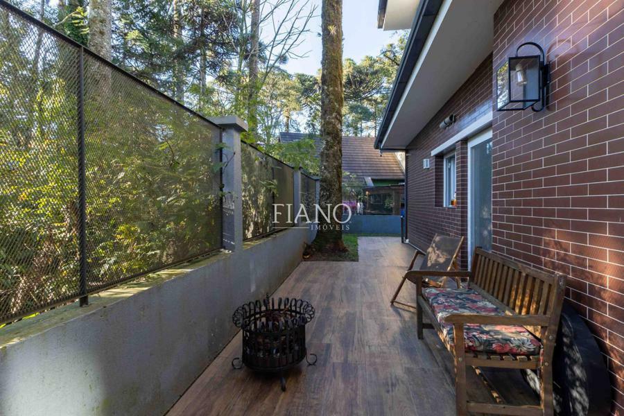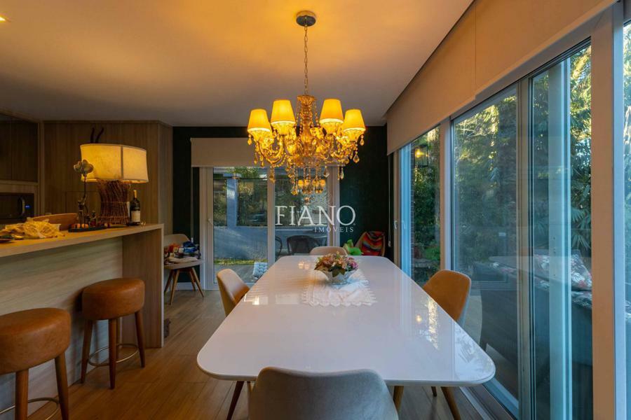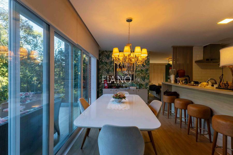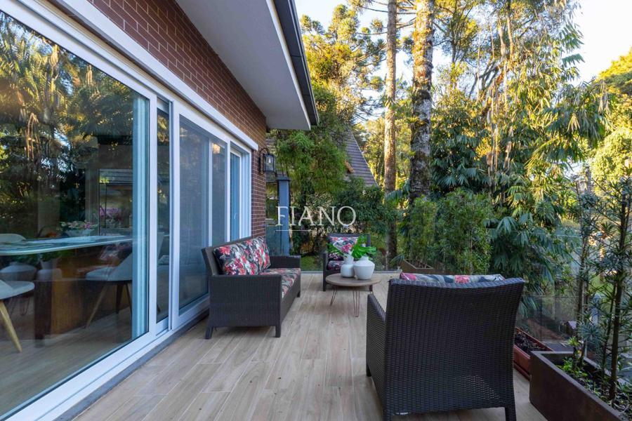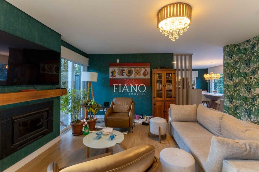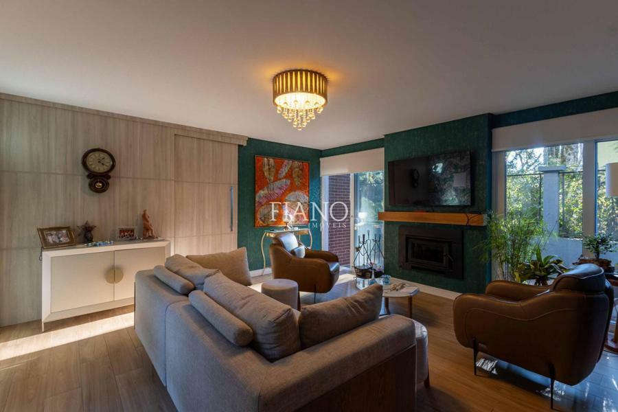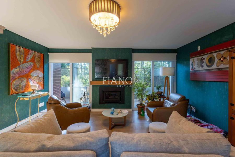 Sala de estar com lareira, varanda com vista para jardim, cozinha gourmet integrada, churrasqueira, lavanderia.