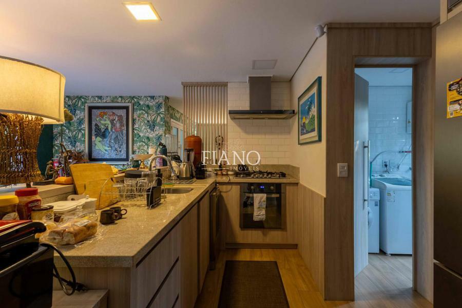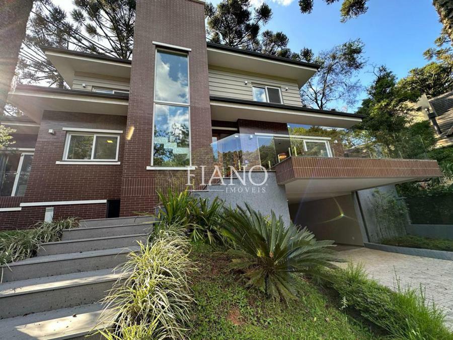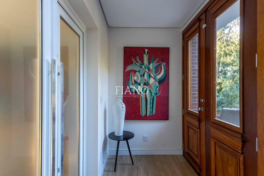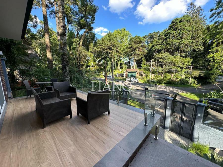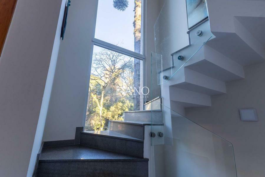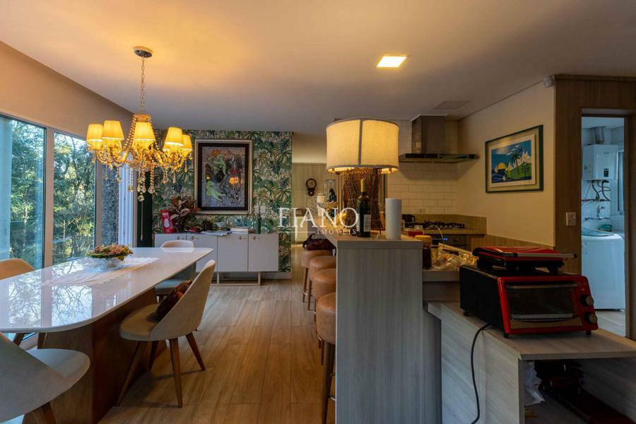 Sala de estar com lareira, varanda com vista para jardim, cozinha gourmet integrada, churrasqueira, lavanderia.