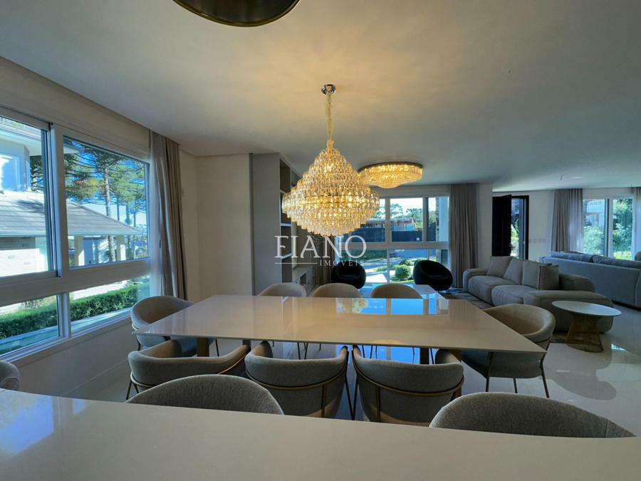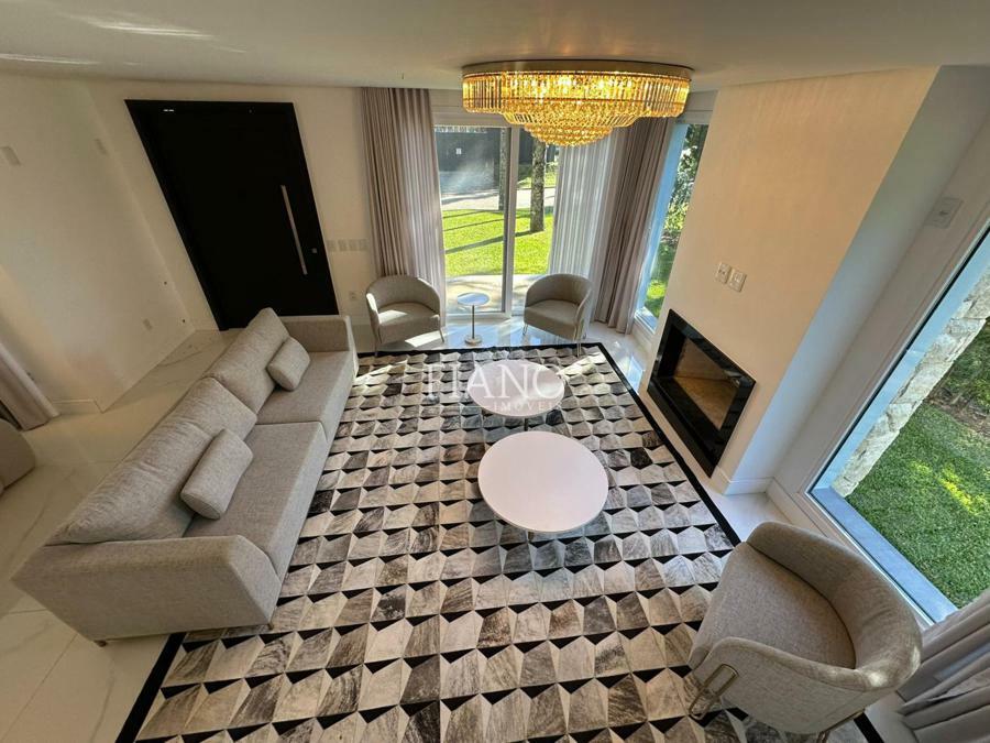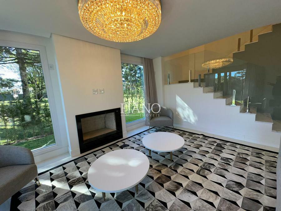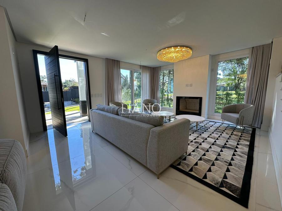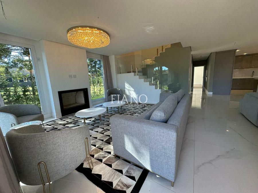 Living com lareira, sala de TV, jantar, cozinha americana com churrasqueira, lavabo, lavanderia, jardim com paisagismo e garagem coberta para dois carros, com espera para carregador de carro elétrico.