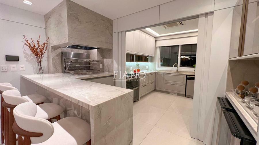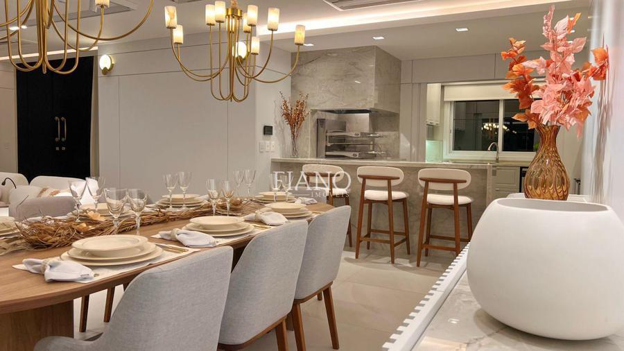 A área gourmet é um deleite para os amantes da culinária, equipada com churrasqueira rotativa elétrica, tela com videoporteiro, adega e cervejeira, além de um espaço para café e uma porta para dividir ambientes, garantindo versatilidade. A cozinha é um primor em funcionalidade, com splits de teto Daikin, móveis em laca com ferragens Blum, geladeira dupla, máquina de lavar louça, fogão com forno duplo, torre de forno e micro-ondas, coifa embutida, triturador de alimentos, lixeiras embutidas, persiana rolô automatizada e prateleiras para eletros. A aspiração central com pá facilita a limpeza.