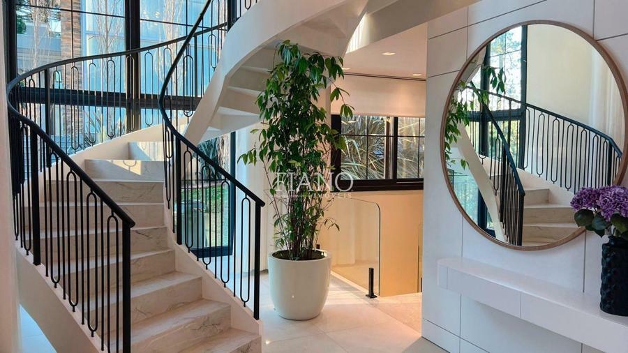 A escada metálica revestida em quartzito Mont Blanc é uma obra de arte, iluminada no piso, e o piso em porcelanato da Portobello, aquecido em todas as áreas frias, garante conforto em qualquer estação. Um elevador TKE e paredes revestidas em laca, com armários para bolsas e chaves, reforçam a funcionalidade, enquanto as cortinas automatizadas e um lustre de cristal adicionam um toque de luxo.